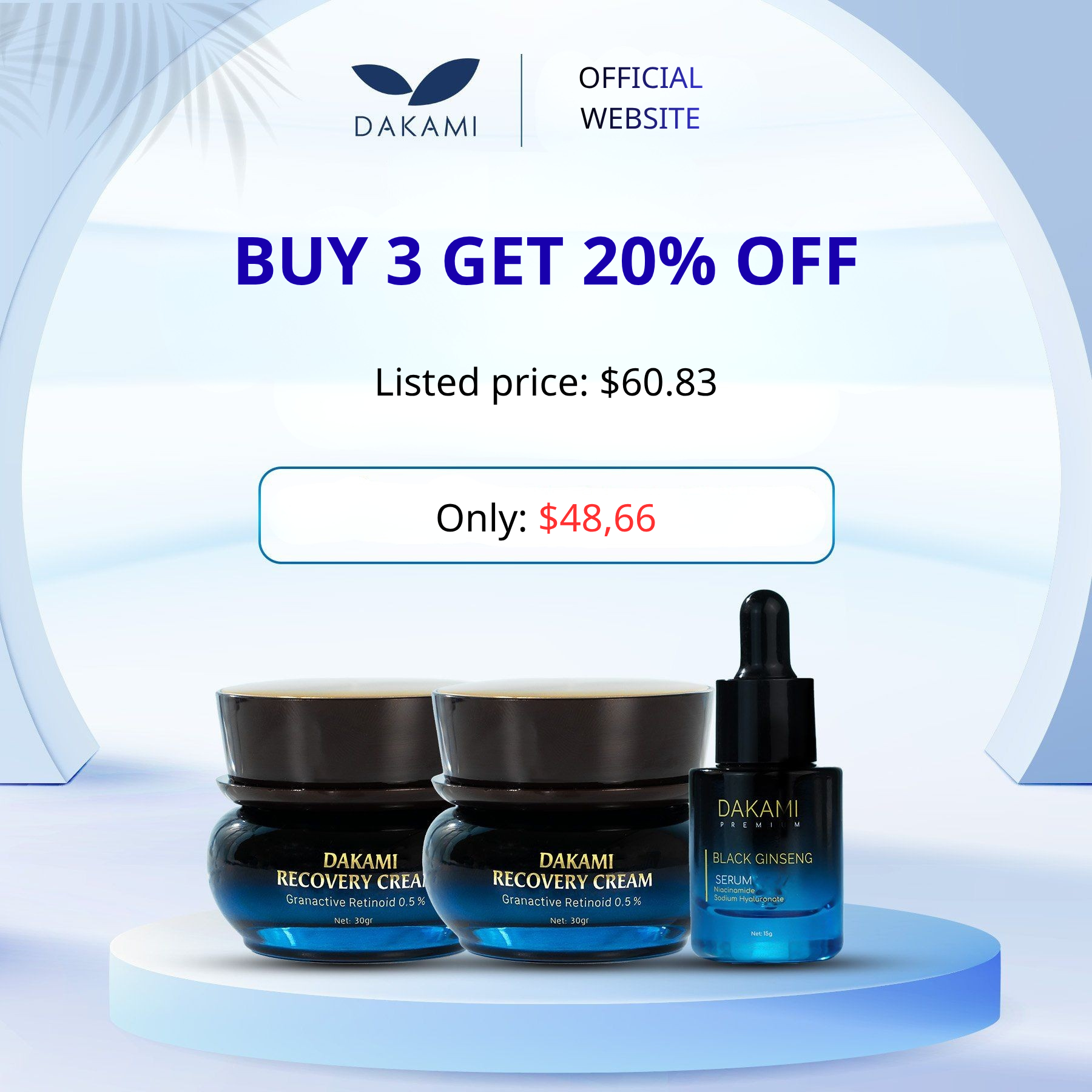 The product set includes: 2 Dakami Black Ginseng anti-aging creams, 1 Black Ginseng multi-layer moisturizing serum.